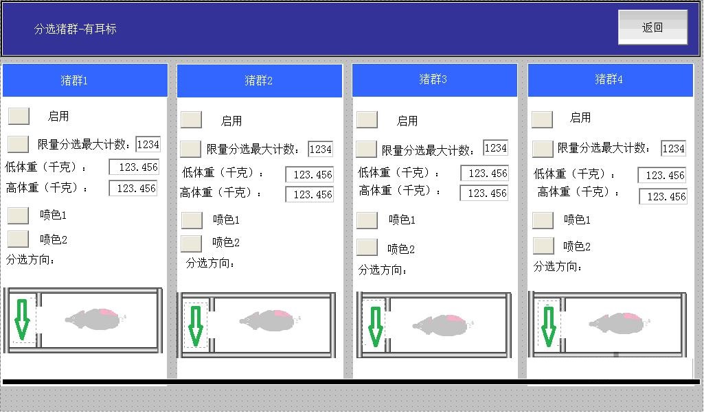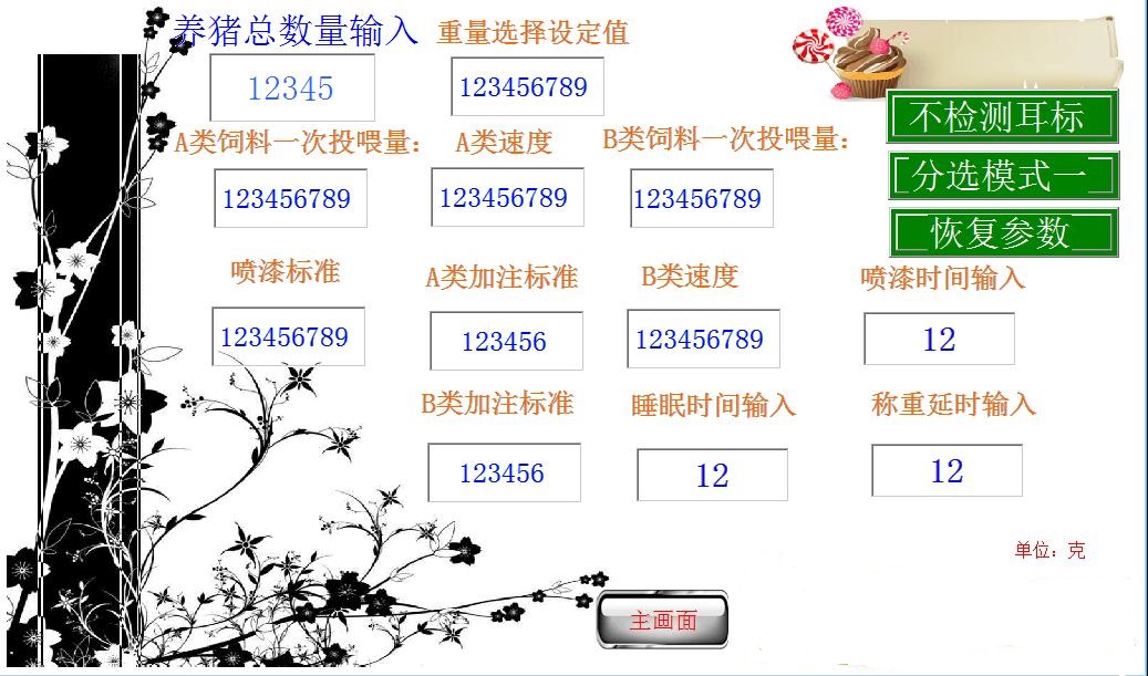 自動上料系統(tǒng)功能按下控制面板上的進紙按鈕后,供紙按鈕被激活,料料自動送入。按下飲水按鈕后,啟動泵并注滿食物罐。自動清洗系統(tǒng)的功能是控制系統(tǒng)在按下控制面板上的去摻雜按鈕后驅(qū)動去污汽車進行清洗操作,并通過傳送帶將牲畜糞便運送到糞便傾倒區(qū)。車間環(huán)境控制系統(tǒng)有三個功能。通過控制電磁閥和水泵,可以控制注入餐飲水箱,車間清洗和車間消毒。