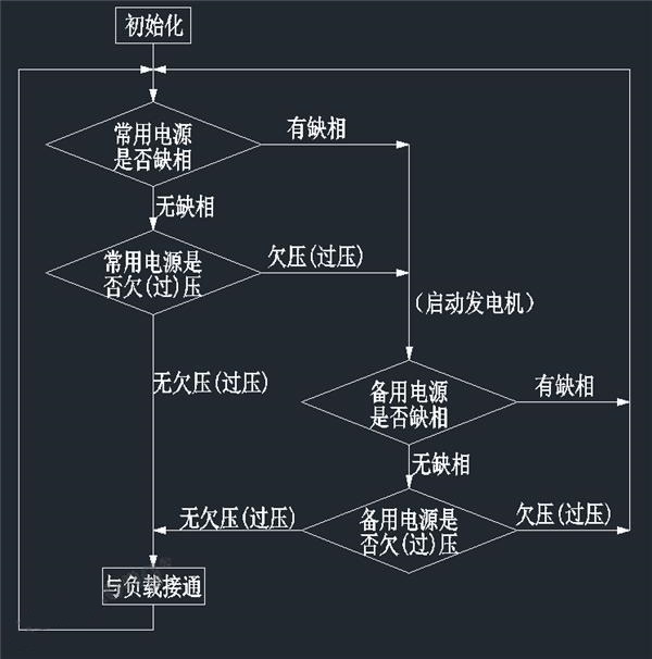 (1)自恢復自恢復模式:控制器監(jiān)視兩個電源。當兩個電源正常工作時,負載由公共電源供電;當公共電源發(fā)生故障(斷電或缺相)時,發(fā)出控制器A切換命令以自動將電源切換到備用電源。此時,負載由備用電源供電。當公共電源恢復正常時,控制器再次發(fā)出切換命令以將負載電力從備用電源返回到公共電源。